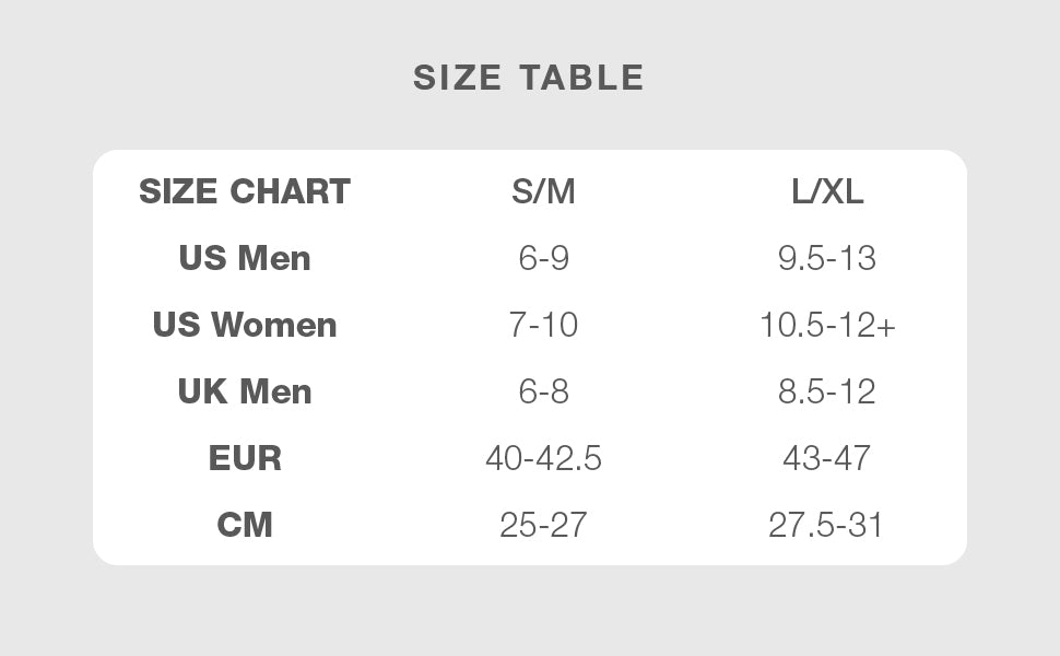 - L/XL: US Men 9.5-13 | US Women 10.5-12+ | UK Men 8.5-12 | EU 43-47 | 27.5-31 CM